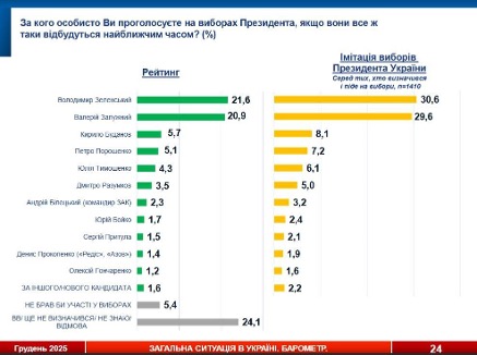 У першому турі чинного президента готові підтримати 21,6% опитаних, Залужного — 20,9%, Буданова — 5,7%.