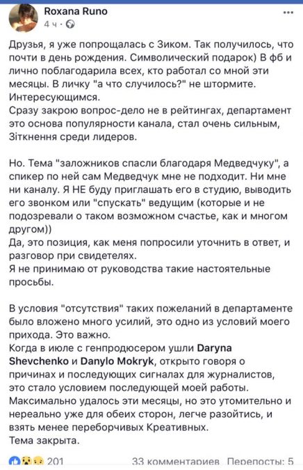 Ведуча і керівник інформаційного департаменту телеканалу ZIK Роксана Руно звільнилася з каналу, оскільки керівництво нав’язувало для участі в ефірах проросійського політика Віктора Медведчука, - пише Новинарня